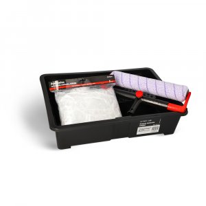 Součástí setu je vanička až na 8 litrů barvy a 5 kusů pevných zakrývacích fólií, které chrání vaničku před znečištěním. Rukojeť je nastavitelná pro válečky od šíře 30cm až do 45cm.